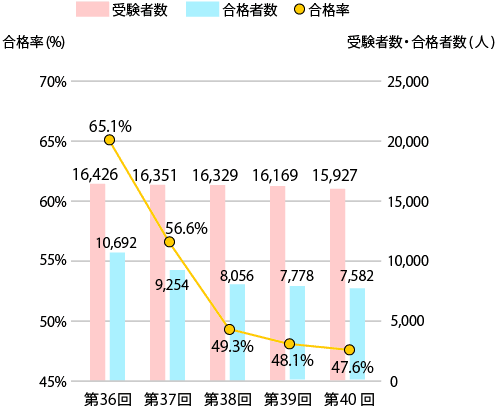 合格率はかつて60%台で推移していましたが、近年は下がりつつあり、50%を割り込むまでになりました。入念な試験対策が求められます。