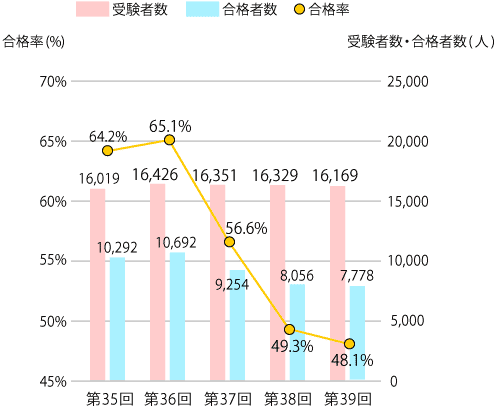 合格率はおおむね60%台で推移していましたが、近年は下がりつつあり、50%を割り込むまでになりました。入念な試験対策が求められます。