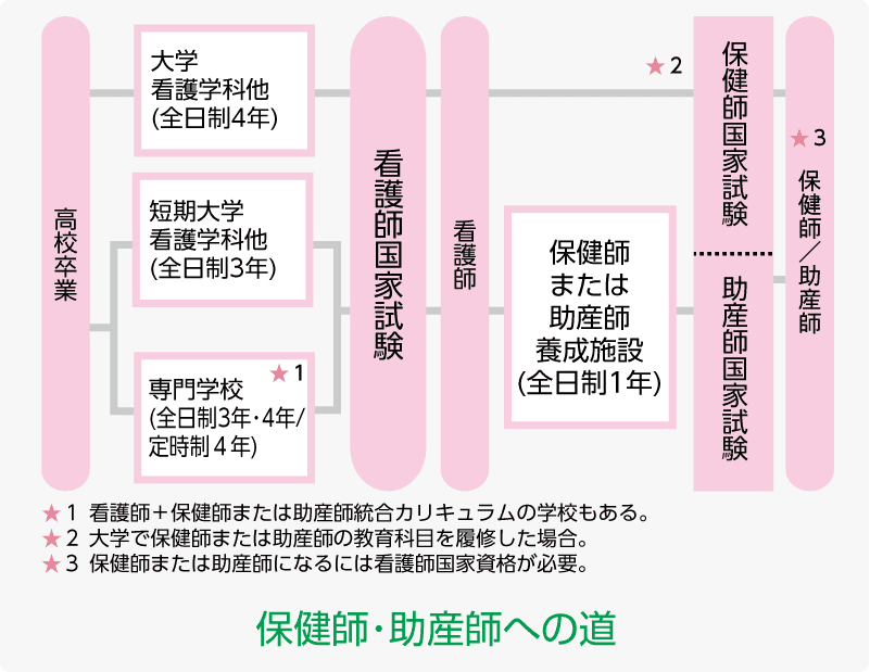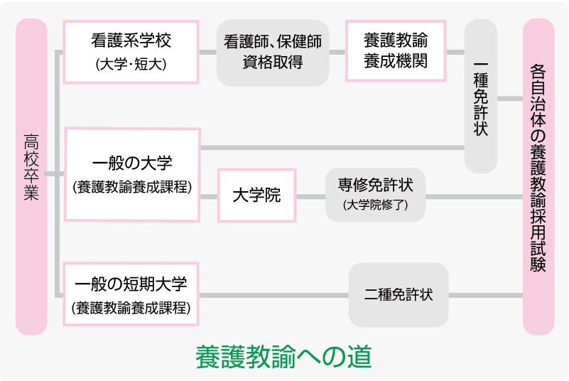 ③高等学校(看護科):高等学校教諭(看護)の免許を取得し、公立高校では教員採用試験に合格することが必要となります。