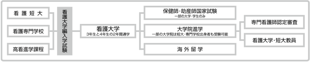 看護短大・専門学校で学んだことをより深めたい、将来様々な分野で活躍したいと考える方には最適の制度です。受験資格を限定する大学や、編入学試験が実施されない大学もあるので注意が必要です。