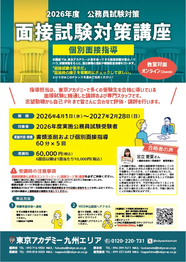 面接対策では、評価ポイント、志望動機・自己PRの構築ヒント、自治体研究の方法、人物試験で役立つ時事問題の解説、模擬集団討論を行います 。論文対策では、書き方の基本、過去テーマ紹介、論文添削(2回)、評価ポイントと高得点記述法の解説を実施します。