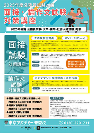 現在の公務員試験のトレンドは“人物重視”です。 本講座では、個別面接練習、面接カード(エントリーシート)の添削指導をいたします。志望動機や自己PRに悩んでいる方も安心して受講できる内容となっています。