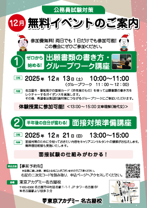 東京アカデミーでは、公務員試験を受験する皆様を応援すべく、各校舎で様々な説明会・個別相談フェア・体験講座 etc.を無料で実施しています。