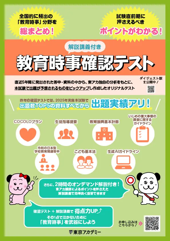 2026年本試験で狙われる教育時事について、全自治体共通の重要テーマから厳選した20問の確認テストを実施します。直前期に押さえておくべき教育動向を効率よく整理した後、2時間の解説講義で知識の欠落や理解不足を解消します。自分がどこまで理解できているかを把握するための講座です。