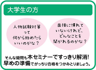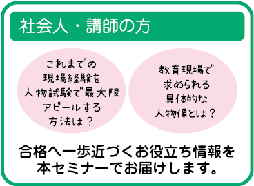 東京アカデミーが長年培ってきた人物試験対策のノウハウ、試験情報をもとに、人物試験突破に向けてぜひ知っておきたい最重要ポイントをお伝えします。「絶対合格」への道はこのセミナーから!